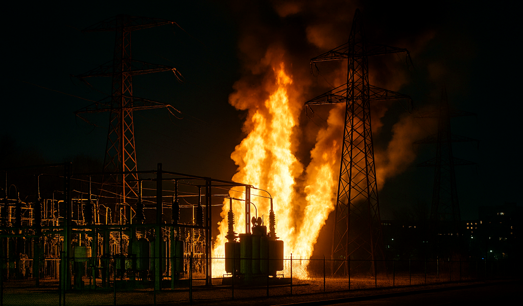 tekoälykuva, AI, sähkö, energia, voimalinja, sähköasema, sähkökatko, suurjännitemasto, terrorismi, äärivasemmisto, poliittinen radikalismi, vandalismi, hengenvaara, infrastruktuurin lamauttaminen, pelasustyöt, tuhopoltto, tulipalo