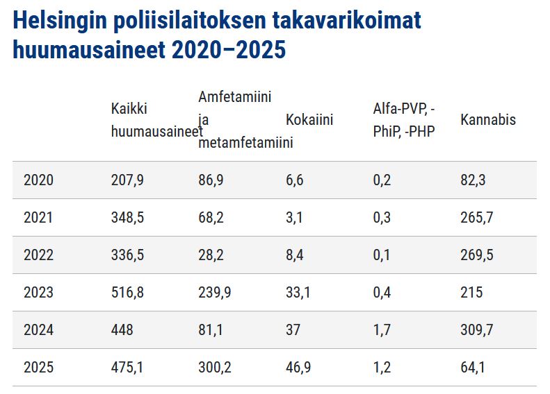 – Huumeet näkyvät poliisitoiminnassa päivittäin. Alfa-PVP on hallinnut julkista keskustelua huumausaineista. Helsingin poliisilaitos on kuitenkin takavarikoinut myös ennätyksellisen paljon amfetamiinia ja kokaiinia. Tilastojen muukaan Alfa-PVP ei ole syrjäyttänyt amfetamiinia, vaan huumeiden käyttö kasvaa kokonaisuutena, kertoo rikostarkastaja Kimmo Sainio.
