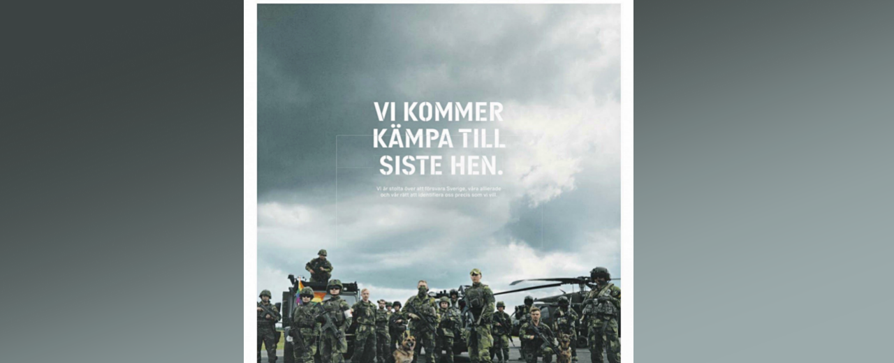 Liityttyään Natoon Ruotsin puolustusvoimat ovat nykyaikaistaneet sanomaansa ja lupaavat nyt taistella homoseksuaalisuuden, Yhdysvaltojen ja Naton puolesta ”viimeiseen mieheen asti”. Viranomaiset käynnistivät eilen Svenska Dagbladetissa väärin kirjoitetun mainoskampanjan, joka herättää kritiikkiä. Ruotsin puolustusvoimat on julkaissut Svenska Dagbladetissa uuden mainoksen, jossa se keskittyy rooliinsa homoseksuaalisuuden edistämisessä ja lojaaliuteen Yhdysvaltoja ja Natoa kohtaan. ”Me taistelemme viimeiseen mieheen asti. … Jatka artikkelin Ruotsin puolustusvoimat: Taistelee ”viimeiseen mieheen” asti lukemista