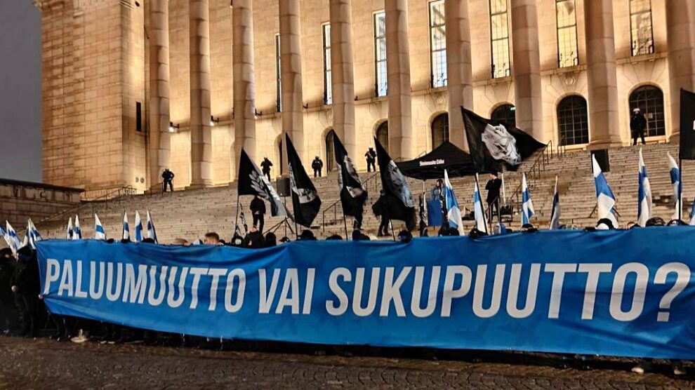 Puheiden loppupuolella eduskuntatalon portaiden edessä nähtiin yllätysspektaakkeli, kun auki vedettiin iso banderolli tekstillä ”Paluumuutto vai sukupuutto?”