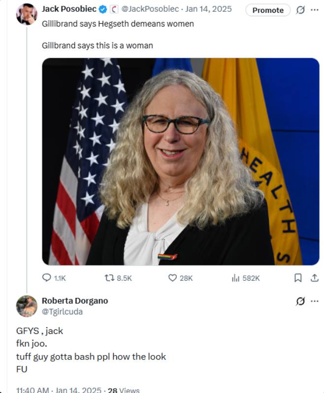 Dorganin X‑tililtä löytyi edellisenä päivänä julkaistu viesti, jossa hän reagoi postaukseen, jossa transmieheksi identifioituva kongressiedustaja Sarah McBride todettiin mieheksi. Dorgan vastasi: “Jatkakaa vain meidän lyömistä. Älkää sitten ihmetelkö, jos me sekoamme.”