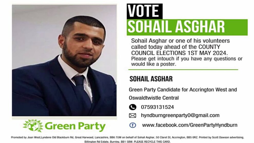 Vihreän puolueen kunnanvaltuutettu, Sohail Asghar, on hyllytetty puolueestaan johtuen nykyaikaisen orjuuden harjoittamisen rikosepäilystä. Accrington West ja Oswaldtwistle Centralissa valtuutettuna toimiva Asghar jatkaa tehtäväänsä vastedes sitoutumattomana.